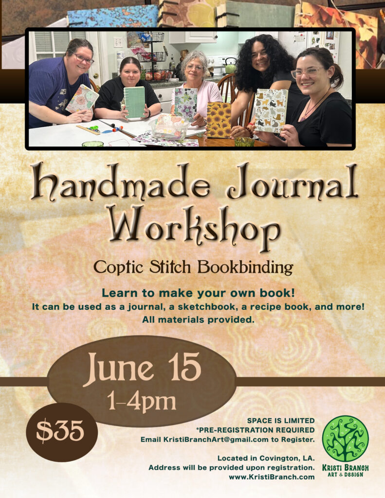 Have you ever wanted to learn make your own sketchbook or journal? In my Bookbinding workshops, I teach you how to bind together a basic book using coptic stitch. You choose your decorative cover paper and color thread.